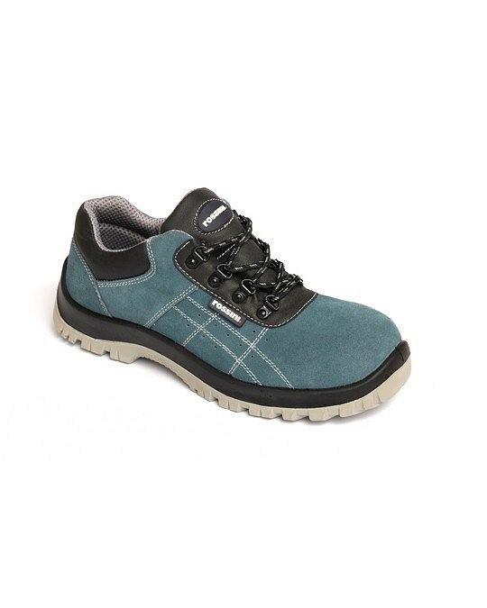 Kék, perforált, velúr, alacsonyszárú cipő, szürke varrás, szürke belső bélés, párnázott nyelv, összetett orr-rész, lamellamentes, légáteresztő és antisztatikus kivehető talpbetét. Két sűrűségű poliuretán talp.