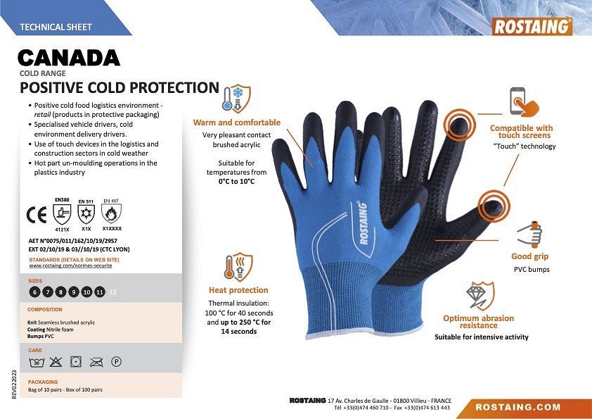 Érintős átmeneti szerelőkesztyű Pozitív hidegélelmiszer-logisztikai környezet - kiskereskedelem (védőcsomagolásban lévő termékek) Speciális járművezetők, hideg környezetbe szállítmányozók. Érintőkészülékek használata a logisztikában és építőipari ágazatban hideg időben Forró alkatrészek kiöntési műveletei a műanyagiparban Kompatibilis az érintőképernyőkkel - "Touch technológia" Jó tapadás, PVC redős Meleg és kényelmes, nagyon kellemes érintésű szálcsiszolt akril 0 és 10 °C közötti hőmérsékletre alkalmas Hőszigetelés: 100 °C 40 másodpercig és legfeljebb 250 °C 14 másodpercig