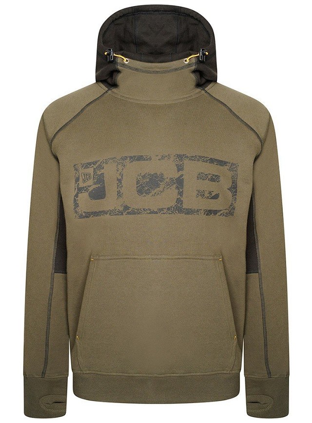 Ez a 80% pamutból és 20% poliészterből készült, 320 g/m² súlyú kapucnis pulóver nehéz, pamutban gazdag anyagból készült, amely melegséget és tartósságot biztosít. A kontrasztos panelek stílusos megjelenést kölcsönöznek, míg a mandzsettákba varrt hüvelykujjnyílások extra kényelmet nyújtanak. Az elülső kenguruzseb praktikus tárolóhelyet biztosít. A mellkason található koptatott hatású JCB logó és további JCB márkajelzések egyedi karaktert adnak ennek a ruhadarabnak, amely ideális választás a mindennapi viselethez vagy a munkaruházathoz.
