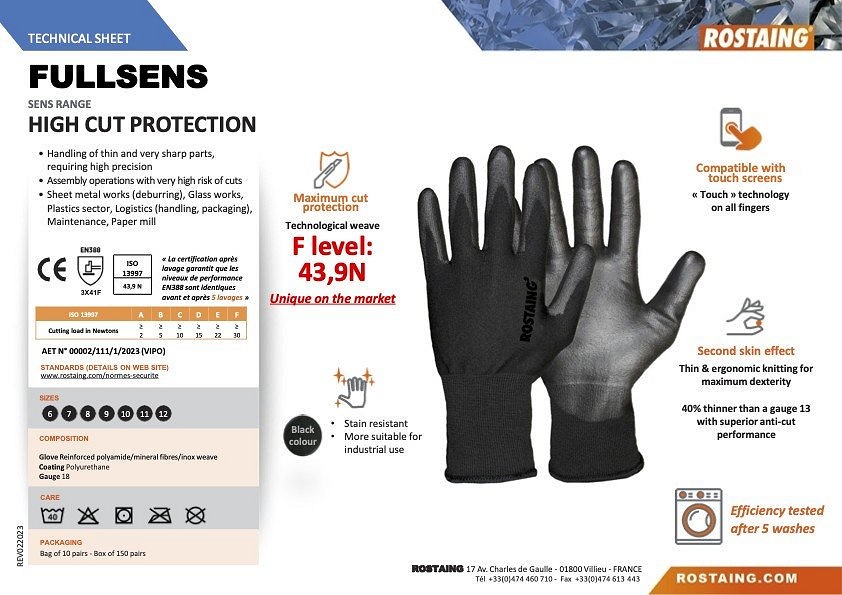 Szerelőkesztyű Vékony és nagyon éles, nagy pontosságot igénylő alkatrészek kezelése Nagyon nagy vágási kockázatú összeszerelési műveletek Lemezipari munkák, üvegipari munkák, műanyagipar, logisztika (kezelés, csomagolás), karbantartás, papírgyár Maximális vágásvédelem - F level: 43,9N Kényelem - vékony és ergonomikus szabás a maximális precizitásért Foltálló Ipari felhasználásra alkalmas Érintőképernyő kompatibilis - "Touch technológia"