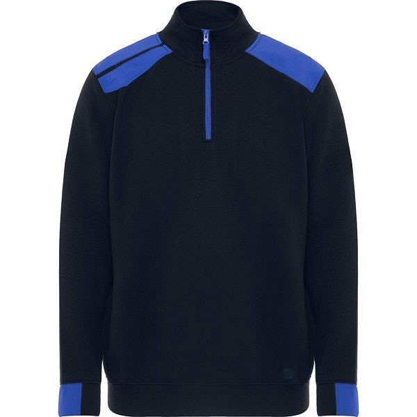 Félcipzáras pulóver kétszínű kombinációban, magas gallérral. Fél mandzsetta és szegély 1x1 bordázott szövetből. Megerősített rejtett varrás a belső gallérban. Kontrasztos vállrészek és részletek.