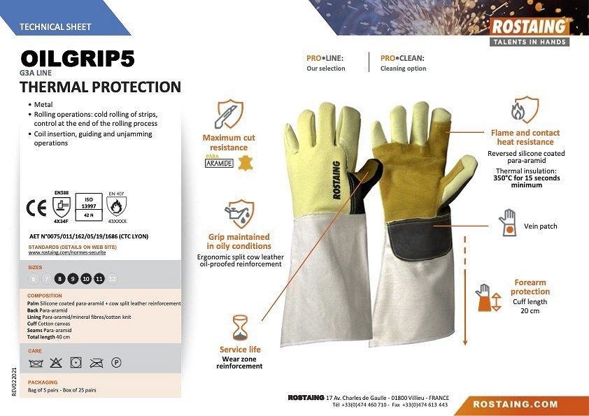 Olajálló védőkesztyű Hővédelem Fém Hengerlési műveletek: szalagok hideghengerlése, ellenőrzés a hengerlési folyamat végén Tekercsbehelyezés, vezetés és elakadásmentesítő műveletek Maximális vágásállóság Olajos körülmények között is megmaradó fogás: ergonomikus, hasított marhabőrből készült, olajjal védett megerősítés Alkarvédelem: mandzsetta hossza 200 mm Vénás tapasz Éintkezési hőállóság és lángállóság: Hőszigetelés: 350 °C min. 15 másodpercig