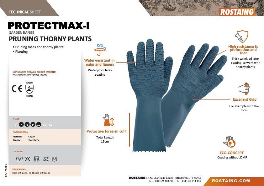 Vízálló hosszúszárú kesztyű TÜSKÉS NÖVÉNYEK METSZÉSE Rózsák és tüskés növények metszése Ültetés Vízálló a tenyérnél és ujjaknál - Vízálló latexbevonat Magas perforációs és szakadási ellenállás: vastag, ráncos latexbevonat a tüskés növényekkel történő munkához Kiváló fogás Alkarvédő mandzsetta- Teljes hossz: 15 mm ECO-CONCEPT: DMF nélküli bevonat
