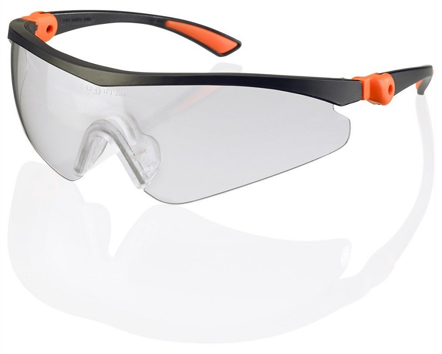 Ez a védőszemüveg fekete kerettel és gumírozott orrnyergével, valamint szárvégekkel rendelkezik a fokozott kényelem érdekében. Az orange racsnis dőlésszög-állító rendszer lehetővé teszi a lencsék szögének módosítását. A szemüveg alacsony hatású védelmet nyújt és 99,9%-os UV-védelmet biztosít. Egyedi csomagolásban, Euro slottal ellátva érkezik. Megfelel az EN166 szabványnak, optikai osztálya 1, alacsony hatású energiát biztosít szélsőséges hőmérsékleteken (F T), és UV szűrőként 5-2.5 jelöléssel rendelkezik.